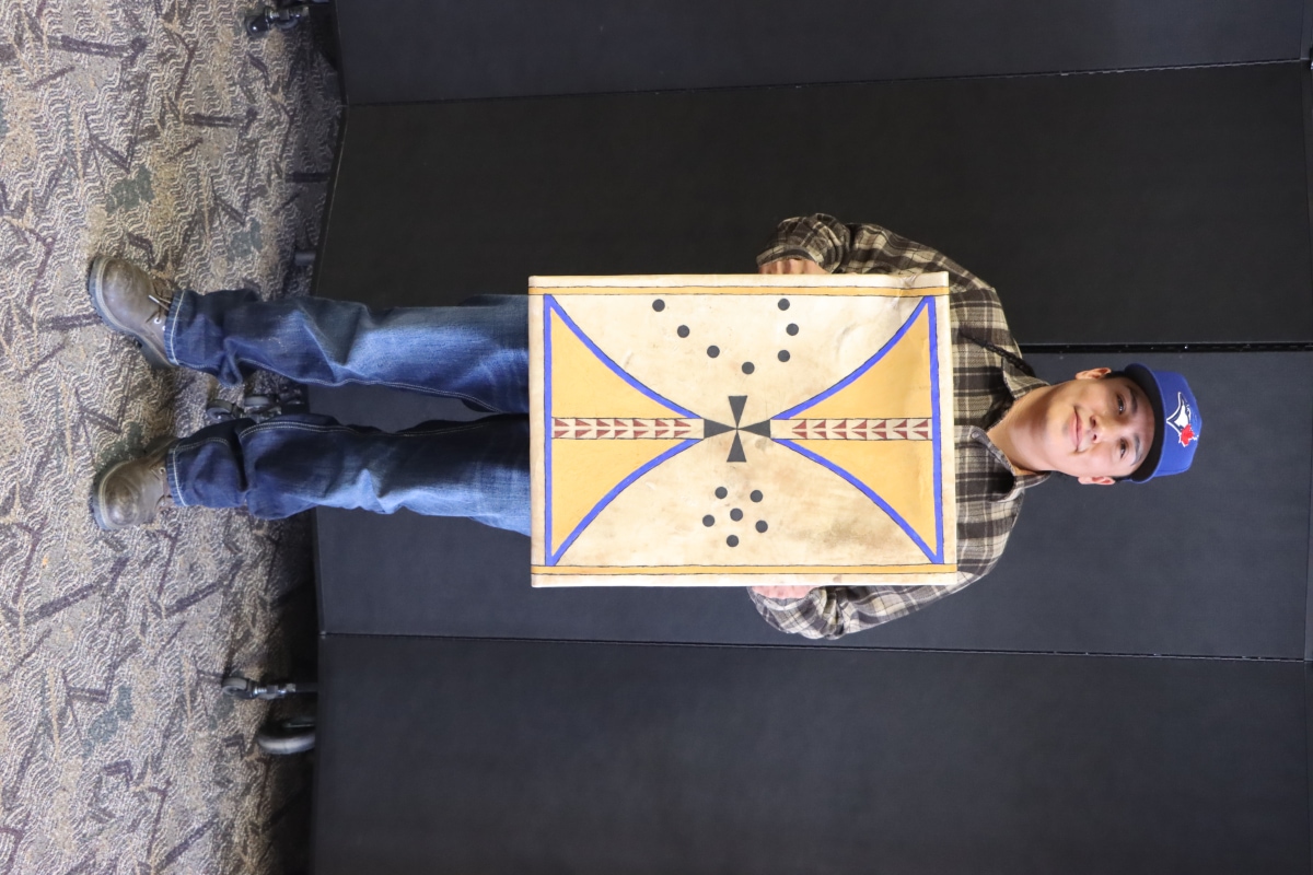 “My art piece will be gifted to my holy mother for her Okan this summer,” he shared. “The design includes Morning Star, The Seven Brothers, and The Lost Children. The materials are elk rawhide that I scraped and tanned myself with help from my father, following traditional guidelines.”